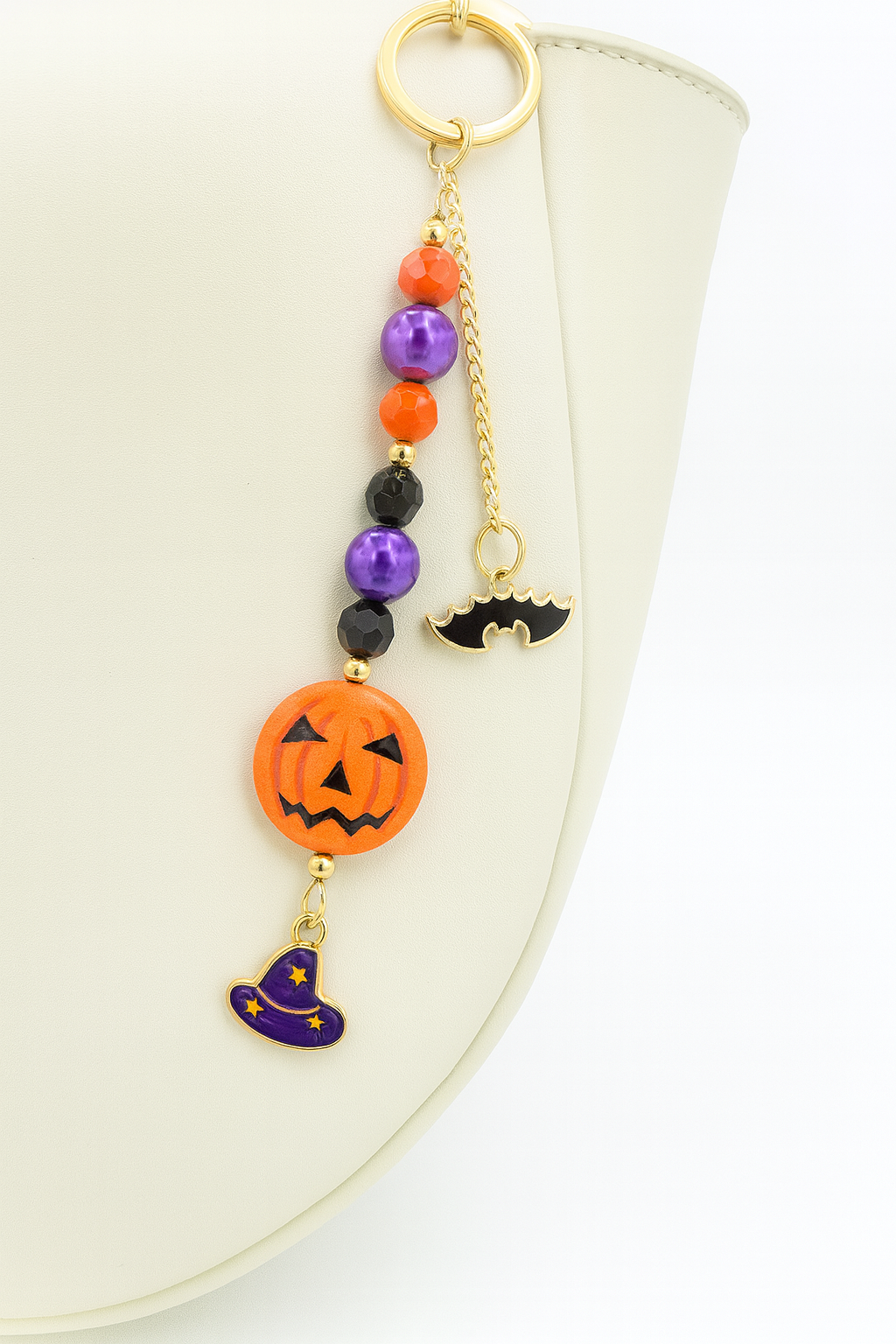 Rule Halloween in style with the Jack O The Pumpkin King Purse Charm. ππ Strung with bold orange, black, and purple beads, this charm features a classic jack-oβ-lantern centerpiece, paired with a spooky black bat and a playful purple witch hat. Finished with luxe gold hardware, itβs the ultimate Halloween statement piece to dress up your tote, purse, or backpack.