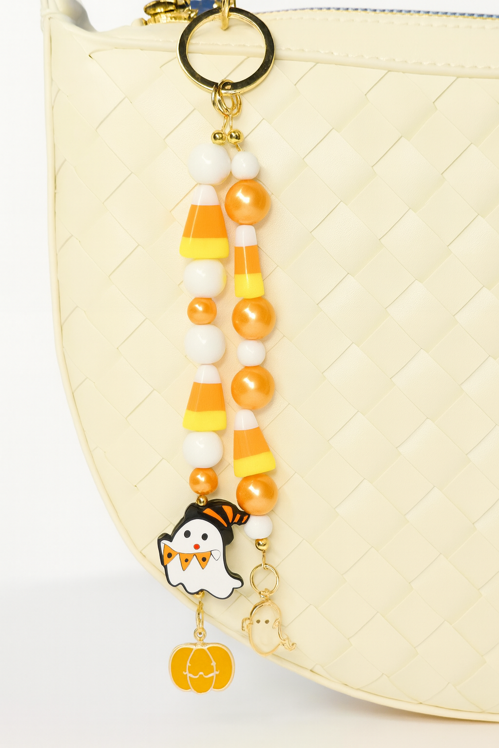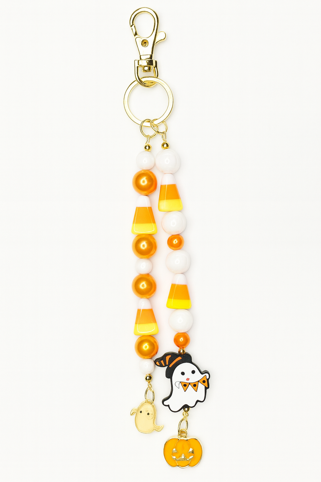 Lil' Party Boo purse charm is the friendliest ghost in town, decked out with Candy Corn beads, pearlescent orange & white beads, gold colored hardware. And an alloy pumpkin & pearly ghost charm, with his party hat, he's ready to bring festive fun to your bag all season long!