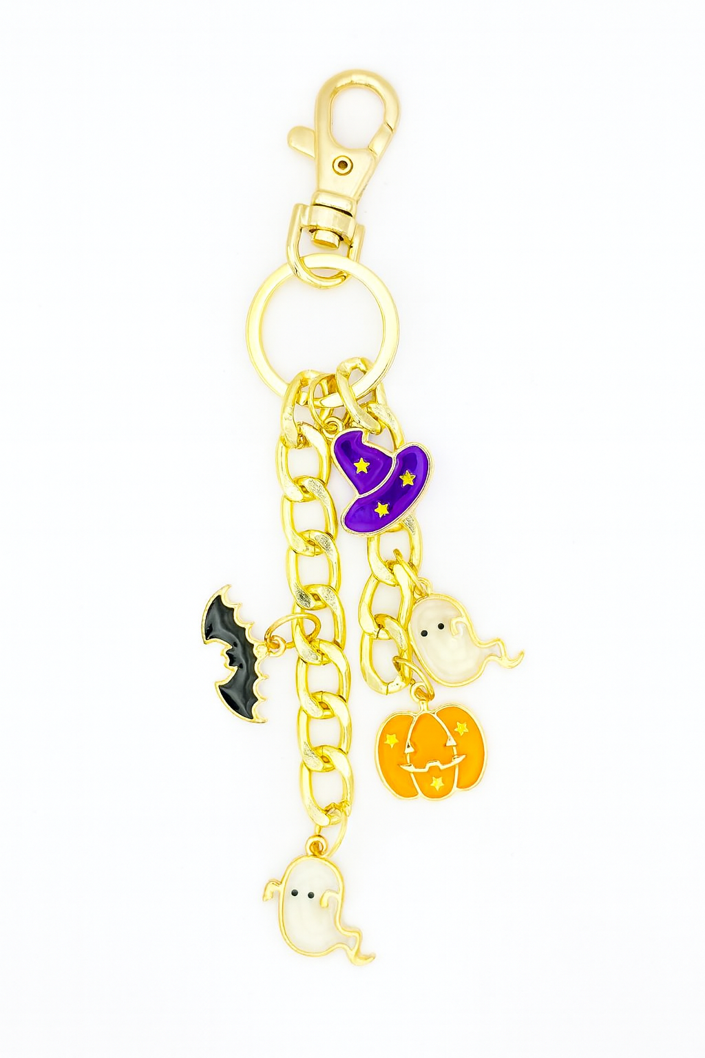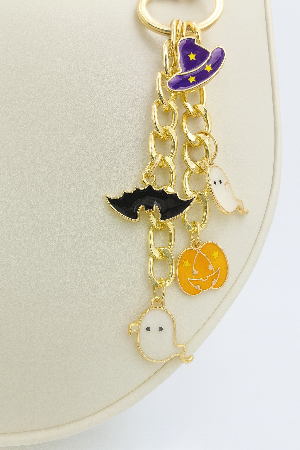 Meet the Spooky Squad the cutest crew to haunt your bag this Halloween! 🎃👻 Featuring a purple witch hat, a cute black bat, a dazzling jack-o’-lantern, and two friendly little ghosts, all dangling from luxe gold chain links, this charm is playful, festive, and just a little spooky. Add it to your Purse, tote, or backpack for the perfect Halloween accessory.